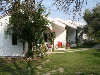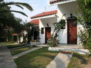 CHADB001-006: Etwas außerhalb von Pefkochori, auf großem Rasen- und Gartengrundstück liegt dieses gepflegte Anwesen, bestehend aus 6 nebeneinander stehenden Reihenhäusern, nah am feinen Sandstrand. 6 Reihenhäuser, zweckmäßig eingerichtet, Baujahr 1995, ca. 30 qm Wohnfläche, 1 Schlafzimmer, inmitten eines Gartengrundstücks mit vielen Blumen, Pflanzen und Bäumen. Ein ebenerdiger Fußweg, direkt am Grundstück vorbei, führt zum schönen, weitläufigen Sandstrand. Wohn-Esszimmer mit 1 Bettcouch für 2 Personen. Angrenzend offene Küchenecke mit 2 E-Kochplatten, kleiner Backofen, Dunstabzug, Kühlschrank mit Gefrierfach, Kaffeemaschine. 1 Schlafzimmer in der offenen Galerie über dem Wohnbereich mit 1 Doppelbett oder 2 Einzelbetten. Bad mit Dusche und WC. Ca. 2000 qm großes gepflegtes Gartengrundstück, überdachte Terrassen. Außengrill zur gemeinsamen Nutzung. Eine Waschmaschine steht in einem separaten Häuschen zur gemeinsamen Mitbenutzung. Parkplatz am Haus. Außendusche. Klimaanlage.