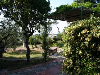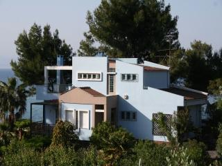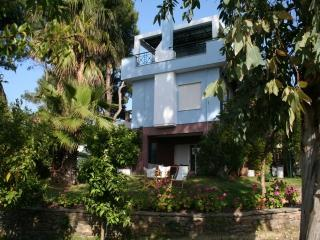 In einem hübschen Villenviertel außerhalb von Vourvourou liegt dieses gepflegte Haus mit 2 Wohnungen, auf einem großen Gartengrundstück mit sehr schönem Meerblick.