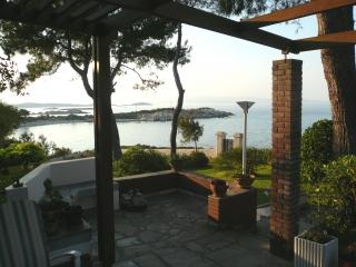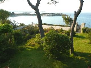 Die Lage dieses Hauses ist bestechend, das türkisfarbene Wasser vor der Gartentür, phantastischer Ausblick auf das Meer und die umliegenden Buchten, ruhig und idyllisch. Alleinstehendes Haus mit 2 Wohnungen, jeweils mit separatem Außeneingang. Wir vermieten die EG-Wohnung mit direktem ebenerdigem Zugang zum Garten. Die obere Wohnung wird im Sommer gelegentlich von der englischsprechenden Eigentümerfamilie bewohnt. Ebenerdige Wohnung, zweckmäßig eingerichtet, Baujahr 1984, renoviert 2004, ca. 70 qm Wohnfläche, 1 Schlafzimmer, inmitten eines sehr gepflegten Rasen- und Gartengrundstückes mit vielen Blumen, Pflanzen, Bäumen und phantastischem Meerblick. Wohn-/Esszimmer mit 3 Bettcouchs für 3 Personen. Angrenzende offene Küchenecke mit E-Herd, Dunstabzug, Kühlschrank mit Gefrierfach, Kaffeemaschine. 1 Schlafzimmer mit 1 Doppelbett. Bad mit Dusche und WC. Ca. 2500 qm großes, abgeschlossenes Gartengrundstück, überdachte Terrasse mit direktem, ebenerdigen Zugang zum Garten. Parkplatz am Haus.