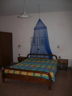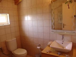 1 Schlafzimmer mit 1 Doppelbett, 1 Schlafzimmer mit 2 Einzelbetten (offene Decke). Bad mit