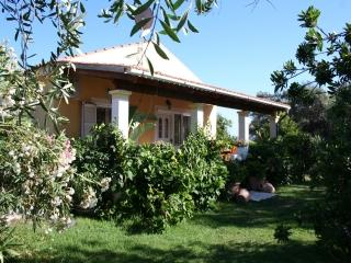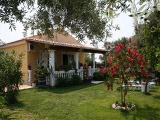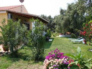 Romantisch gelegenes Einzelhaus, zwischen Olivenhainen, auf einem kleinem abgeschlossenen und sehr gepflegtem Gartengrundstück unweit des schönen Sandstrandes von Skidi. Alleinstehendes, sehr gepflegtes Einzelhaus, komfortabel und geschmackvoll eingerichtet, Baujahr 2003, ca. 75 qm Wohnfläche, 2 Schlafzimmer, inmitten eines Gartengrundstücks. Wohn-/Esszimmer mit SAT TV, 1 Bettcouch für 2 Personen, angrenzend offene Küchenecke, Einbauküche mit E-Herd, Dunstabzug, Kühlschrank mit Gefrierfach, Kaffeemaschine. 1 Schlafzimmer mit 1 Doppelbett, 1 Schlafzimmer mit 2 Einzelbetten. Bad mit Wanne und WC. Waschmaschine. Ca. 250 qm großes abgeschlossenes Gartengrundstück, Terrasse mit Sonnenschirm, schöne Gartenmöbel, Sonnenliegen. BBQ. Außendusche. Klimaanlage. Parkplatz am Haus. An allen Fenstern und Türen Fliegenschutzgitter.