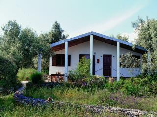 Zweckmäßig eingerichtetes Einzelhaus auf großem Hanggrundstück mit Panorama- und Meerblick, Baujahr 1991, ca. 33 qm Wohnfläche. 1 Schlafzimmer mit Doppelbett, inmitten eines großen Gartengrundstücks mit Olivenhainen. Wohn-/Schlafzimmer mit 1 Bett (Zustellbett möglich), Küche mit 3-Flammen-Gaskocher, Kühlschrank. 1 Schlafzimmer mit Doppelbett. Bad mit Dusche und WC. Ca. 40 qm große Terrasse und ca. 10.000 qm großes Grundstück mit 3 weiteren Häusern.