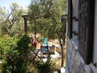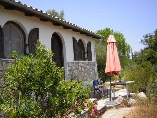 Einzelhaus auf großem Hanggrundstück mit Panorama- und Meerblick. Zweckmäßig eingerichtetes Haus, Baujahr 1991, ca. 33 qm Wohnfläche, 2 Schlafzimmer, inmitten eines großen Gartengründstücks mit Olivenhainen. Wohn-/Essküche mit 3-Flammen-Gasherd, Kühlschrank. 1 Schlafzimmer mit Doppelbett. 1 kleines Schlafzimmer mit Etagenbett. Bad mit Dusche und WC. Ca. 30 qm überdachte Terrasse und ca. 10.000 qm großes Grundstück mit 3 weiteren Häusern.