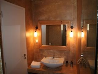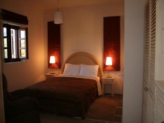 Wohnzimmer mit Kamin, Plasma SAT TV, 2 Einbaukleiderschränke, 2 sehr komfortabel gemauerte Bettcouches (2,20 x 0,80 m) für 2 Personen. Angrenzend die zu einer Seite hin offenen Küche mit Essbereich, Ceranfeld, Backofen, Dunstabzug, Kühlschrank mit Gefrierfach, Kaffee-und Espressomaschine. Bad mit Wanne und WC. Vom Wohnzimmer direkter Ausgang auf ca. 15 qm große überdachte Terrasse mit Blick auf den Pool und das Meer. Eine Innentreppe führt ins 1. OG. 1 Schlafzimmer mit 1 Doppelbett, TV, holzvertäfelte hohe Decke, über eine Leiter zum Alkoven mit 1 Doppelbett (1,40 breit) geeignet für 2 Kinder. Vom Schlafzimmer direkter Ausgang auf ca. 30 qm grosse teils überdachte Terrasse mit phantastischem Blick aufs Meer. Bad mit Duschkabine, Waschtisch und WC. Ca. 4.000 großes abgeschlossenes, gemeinsames Rasen- und Gartengrundstück.
