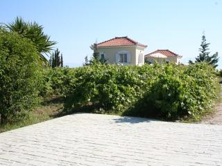 Die 4 gepflegten Orfanos-Einzelhäuser liegen auf einem großen, hauptsächlich von Wein bewachsenen Grundstück, ca. 50 m voneinander entfernt, oberhalb des Strandes von Aghia Triada.