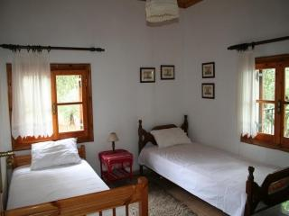 Ruhig, idyllisch und abgeschieden auf einem großen Naturgrundstück mit Olivenbaumbestand liegt dieses Einzelhaus, auf dem Weg zum schönen Strand von Petalidi. Alleinstehendes, gepflegtes, zweckmäßig eingerichtetes Einzelhaus, Baujahr 1985, ca. 70 qm Wohnfläche, 2 Schlafzimmer, inmitten eines Olivenhaines mit Meerblick. Wohn-/Esszimmer mit Kamin, Sofabett, angrenzende Einbauküche mit E-Herd, Dunstabzug, Kühlschrank mit Gefrierfach, Kaffeemaschine. 1 Schlafzimmer mit 1 Doppelbett und 1 Zustellbett, 1 Schlafzimmer mit 2 Einzelbetten. Bad mit Dusche und WC. Ca. 4000 qm großes Naturgrundstück, Weinlaub-überdachte Terrasse mit Blick über die Olivenhaine bis auf das Meer. Parkplatz am Haus. Fliegenschutzgitter an allen Fenstern.