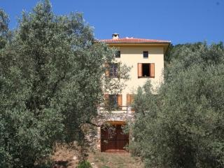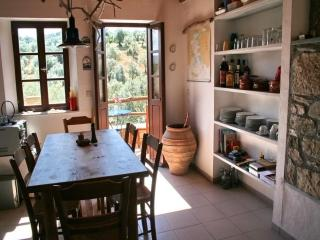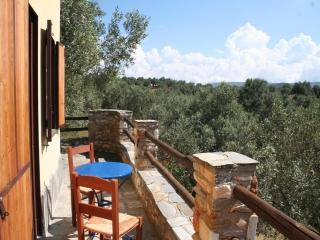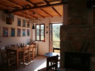 2 Schlafzimmer, inmitten eines großen Olivenhains in leichter Hanglage. EG: Esszimmer mit Kaminofen, SAT TV, angrenzende offene Küche mit E-Herd, Kühlschrank mit Gefrierfach, Kaffeemaschine. Bad mit Dusche, WC und Waschmaschine. Eine Holztreppe führt ins 1. OG: 1 Schlafzimmer mit Doppelbett. 2. OG: offenes holzvertäfeltes Schlafzimmer unter dem Dach, mit 1 Doppelmatratze, geeignet für 2 Kinder oder Jugendliche,