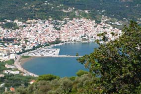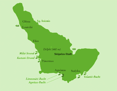 Skópelos ist eine etwa 35 Kilometer lange Insel der Sporaden und liegt in Sichtweite 4 km westlich von Alonissos und 8 km östlich von Skiathos. Auf Skopelos leben ca. 6000 Menschen, davon 1000 in der nördlichen Stadt Glossa mit dem dazugehörigen Hafenörtchen Loutraki, 4000 in Skopelos-Stadt und die restlichen in den Dörfern. Die Fähren fahren sowohl Loutraki als auch Skopelos-Stadt von Skiathos und Volos aus an.