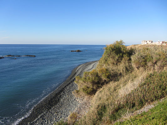 außerhalb des Dorfes Pomos, direkt am Wasser. Bis zu dem