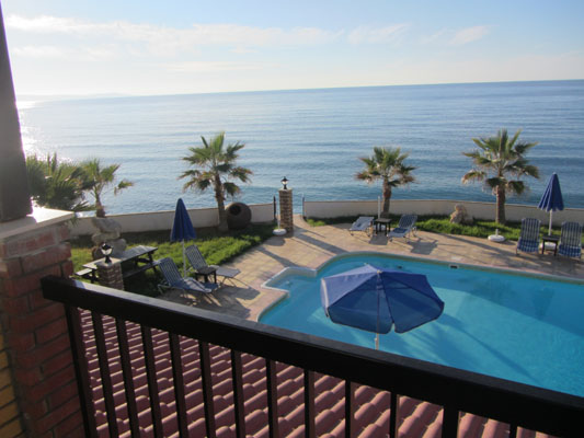 das Meer. Zu der Anlage gehören ein Swimmingpool mit Liegen
