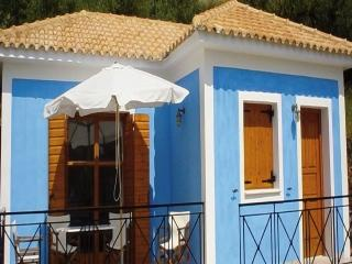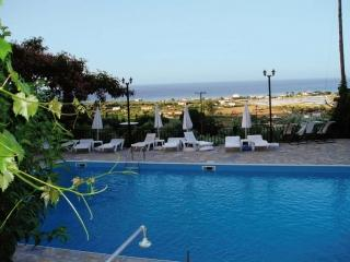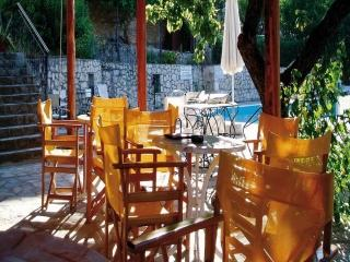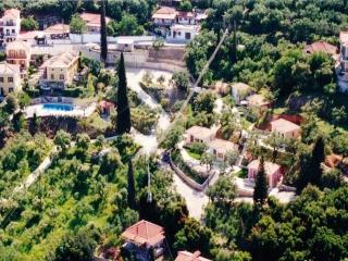 Im Nordosten der Insel über der Alykes Bucht gelegene gepflegte Ferienhausanlage mit Pool auf riesigem Grundstück, in grüner Umgebung mit phantastischem Blick aufs Meer.