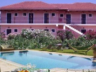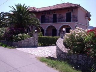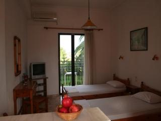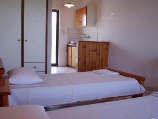 Die kleine, gepflegte Studioanlage Eleni steht auf einem ca. 4000 qm großen Rasen- und Gartengrundstück. Die zweigeschossige Anlage hat insgesamt 12 Studios. Seitlich der Studios liegt der ca. 4000 qm große eigene Weinberg der Eigentümer. Ein BBQ steht allen Gästen zur gemeinsamen Benutzung zur Verfügung. 150 qm großer Pool und 12 qm großes Kinderbecken. Kinderspielplatz. Parkplatz. Die zweckmäßig eingerichteten Studios liegen jeweils im OG und EG des Hauses. Baujahr 1985, renoviert 2001, ca. 28 qm Wohnfläche, 1 Raum, inmitten eines ca. 300 qm großes Gartengrundstücks mit Blumen, Pflanzen und Palmen. Eingangsbereich mit offener Küchenecke mit 2 E-Platten, Kühlschrank mit Gefrierfach, Kaffeemaschine. Durch eine ca. 80 cm hohe Theke getrennt von der Küchenecke, der Raum mit 2 Einzelbetten, Zusatzbett möglich auf Anfrage für 1 Kind. SAT-TV. Bad mit Dusche und WC. Überdachter Balkon. Außendusche. Klimaanlage.