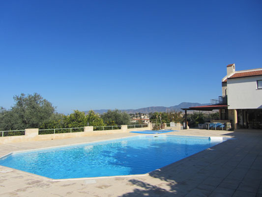 und über einen Swimmingpool mit Liegen u. Sonnenschirmen.